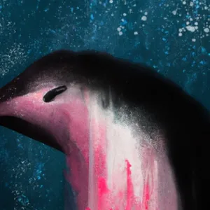 A solitary penguin stands beneath a quiet snowfall, its form emerging from deep blues and shadows while streaks of luminous pink bleed down its chest like exposed code written across a dark terminal. The figure is both vulnerable and resilient, an inhabitant of the margins, living at the edge of a frozen world where survival depends on adaptation and community.