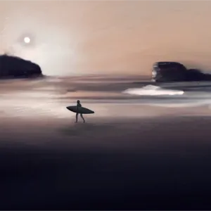 A lone surfer stands in quiet reflection at the water’s edge, reduced to a simple dark form against a glowing coastal sky. Soft, muted tones of amber, blush, and misty grey blend seamlessly across sea and sand, capturing that fleeting moment between day and night when the world feels still and weightless.