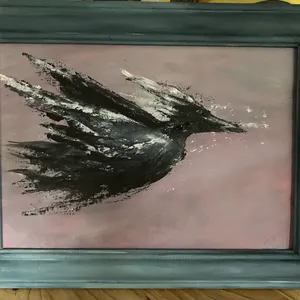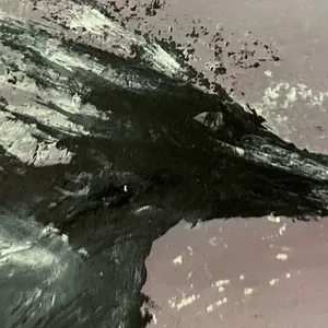 In The Leaving of Liverpool, the Liver bird takes flight across a quiet, dusky sky. Painted with raw, sweeping strokes, its wings seem to fragment into the air behind it, as if the city itself is being carried away in memory. The soft pink background contrasts with the powerful black form, capturing both freedom and the bittersweet moment of leaving home.